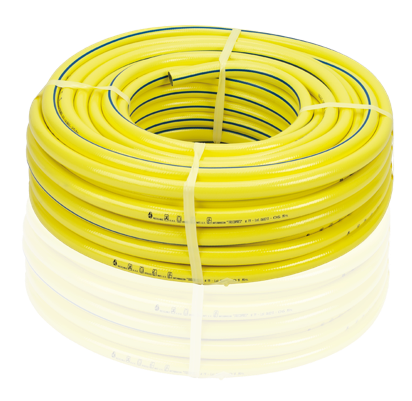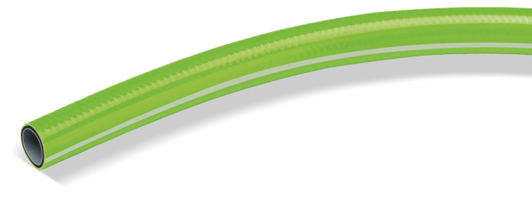 - Manguera de PVC plastificada de tres capas, con refuerzo textil tricotado de poliéster de alta tenacidad con tecnología AMR (Anti-twist Multidirectional Reinforcement) que evita la torsión bajo presión conservando la flexibilidad, lo que le confiere mayor resistencia y flexibilidad.